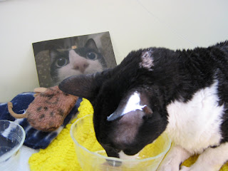 Today we both get our flooooids. See how mommie sticks that pin in my back? It idoes not hurt so bad. I keep Adan's picture close by, because he is my tuxie buddy.